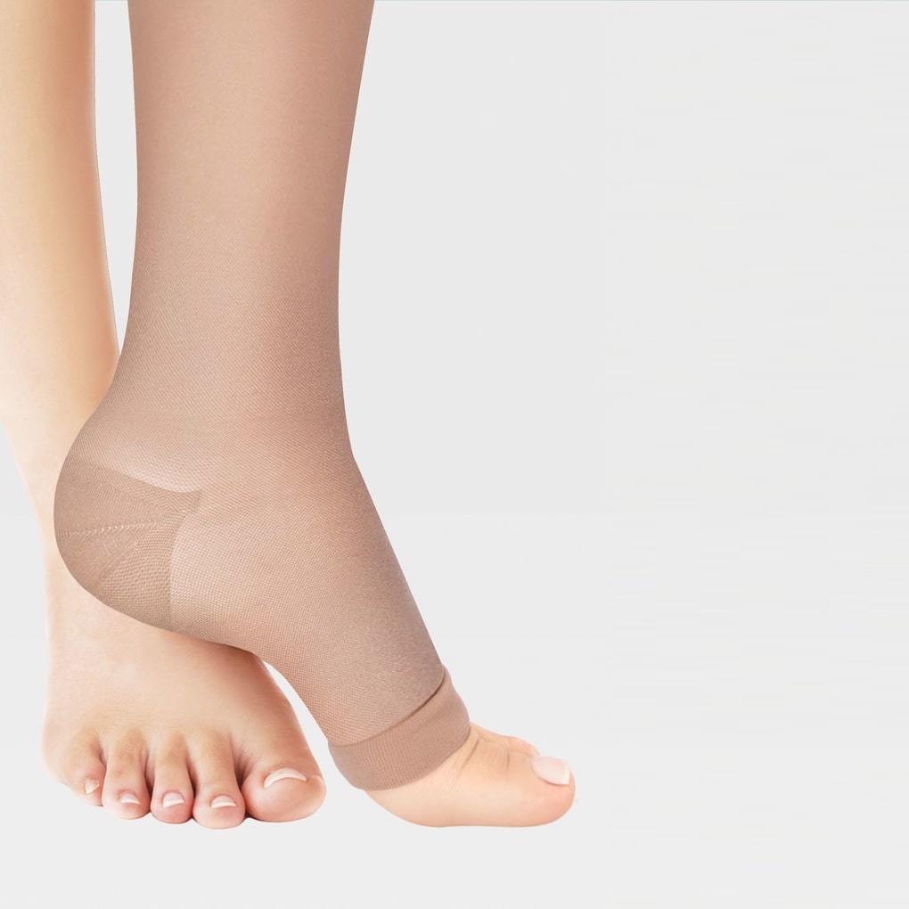 1. Возьмите верх изделия рукой и, выворачивая, стяните вниз до колена, затем до лодыжки и до носка.