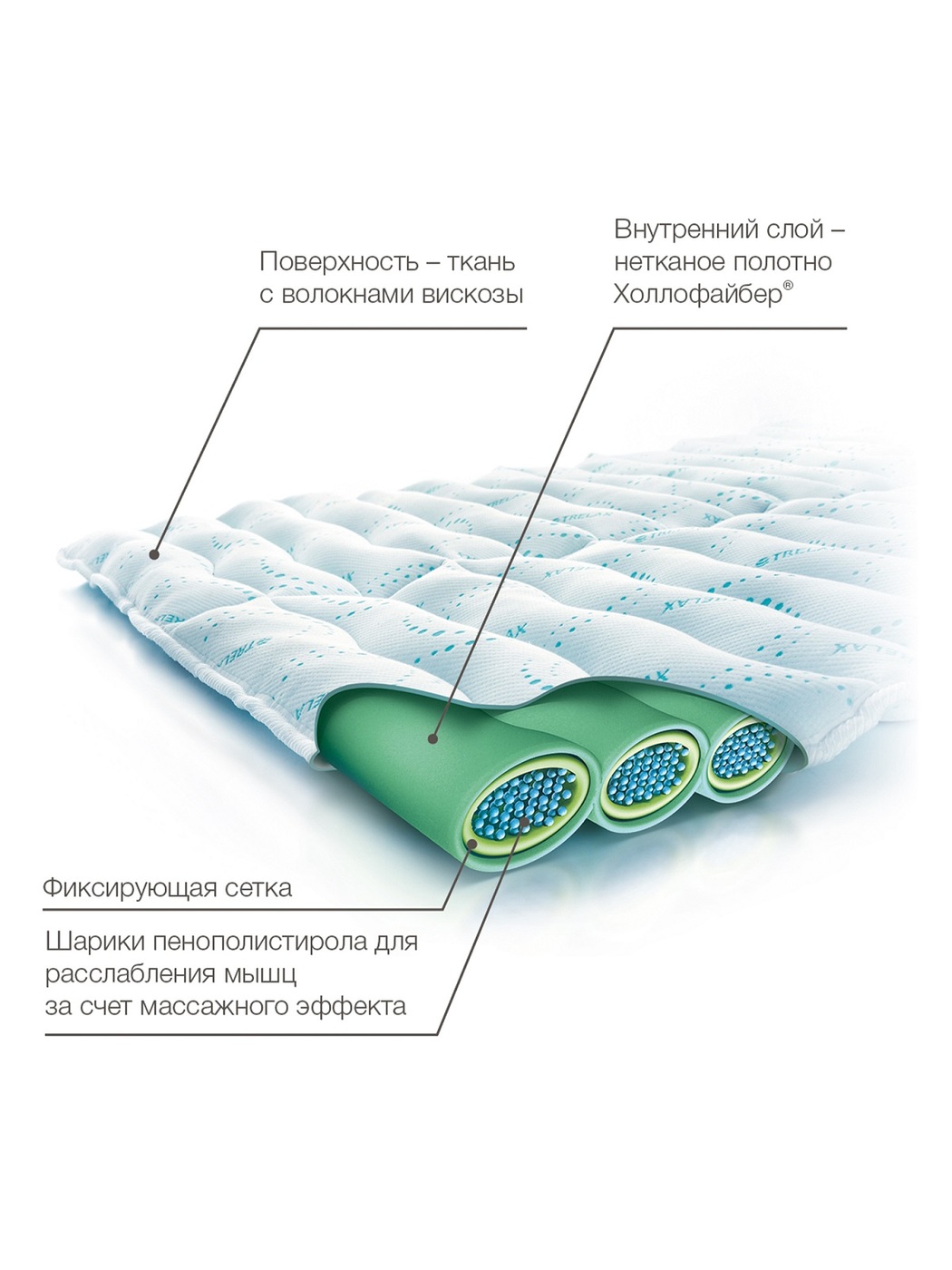 В производстве используется несколько видов материалов: трикотажная ткань «Тритекс», как чехол для всего изделия; специальный слой с объемным термо-скрепленным полотном, состоящим из волокон; наполнитель из шариков пенополистирола.